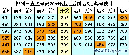 四、排列三直选号码209历史上开出6次,其前后五期奖号分别为: