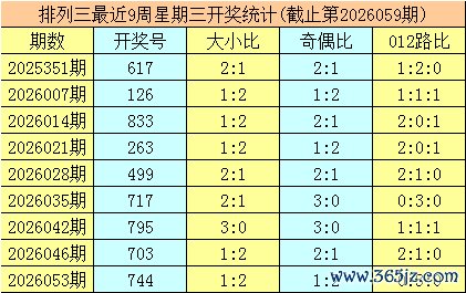 三、体彩排列三前9周星期三奖号分别开出:617-126-833-263-499-717-795-703-744,其中号码012路比为11:12:4,奇偶比为17:10,大小比为14:13;