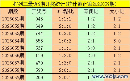 一、排列三第2026059期开出号码209,其奇偶比为1:2,大小比为1:2,号码012路比为2:0:1。该号码直选历史上出现了6次。