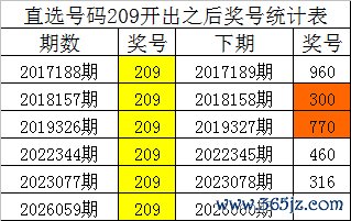 从上表统计可以看出,直选号码209开出之后,其下期奖号:
