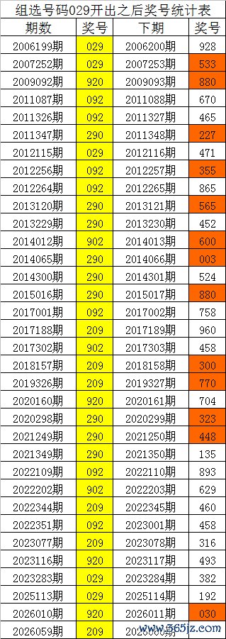 体彩排列三组选号码029历史上出现了34次,其下期奖号分别为:928、533、880、670、465、227、471、355、865、565、452、600、003、524、880、758、960、458、300、770、704、323、448、135、893、629、460、458、316、493、382、192、030,详细统计见下表: