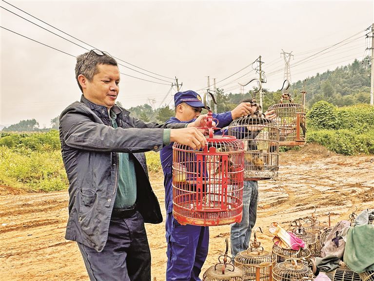 经现场观察,工作人员确认画眉鸟健康状况良好且具备野外生存能力后,依次打开鸟笼进行放生(如图)。据该县林业局工作人员介绍,画眉鸟于2021年2月被列入《国家重点保护野生动物名录》,属于国家二级保护野生动物,禁止非法猎捕、收购、运输和出售。呼吁广大群众遵守国家法律法规,敬畏自然、尊重生命,协力保护生物多样性,共同建设人与自然和谐共生的美丽家园。