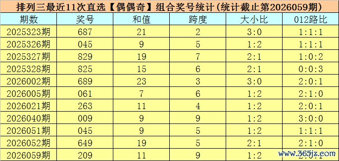 开奖回顾:排列三第2026059期开出奖号:209,类型为组六,和值为11,奇偶比为1:2,大小比为1:2,跨度为9。